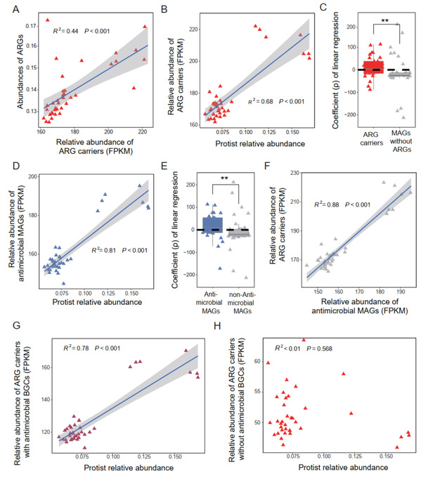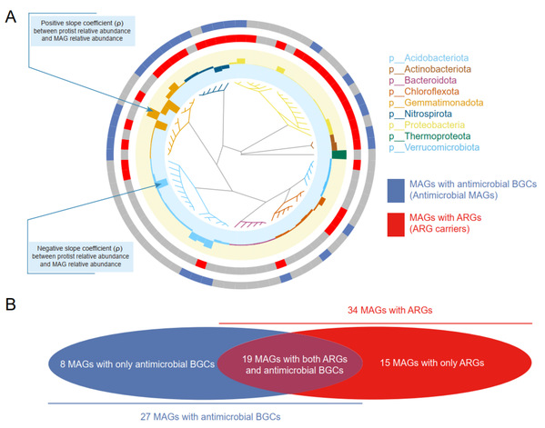 該研究通過多組學分析與室內培養實驗相結合,首先對田間土壤樣本進行了宏基因組測序分析,發現了土壤原生動物與ARGs直接的線性關系。隨后利用宏基因組數據獲得了土壤高質量的細菌基因組,并在基因組中識別了潛在的抗生素抗性基因(ARGs)和生物合成基因簇(Biosynthetic Gene Clusters, BGCs),通過這一分析對細菌基因組功能進行了預測,并發現了土壤原生動物豐度與抗生素生產細菌之間呈現顯著正相關。此外,室內共培養實驗也驗證了這一機制,在原生動物捕食壓力下,土壤微生物群落中的抗生素生物合成相關基因以及ARGs的表達均顯著增加。綜合研究結果表明,土壤原生動物捕食使能產生拮抗性次級代謝物的細菌具有競爭優勢,從而間接促進了抗生素耐藥菌的繁殖。