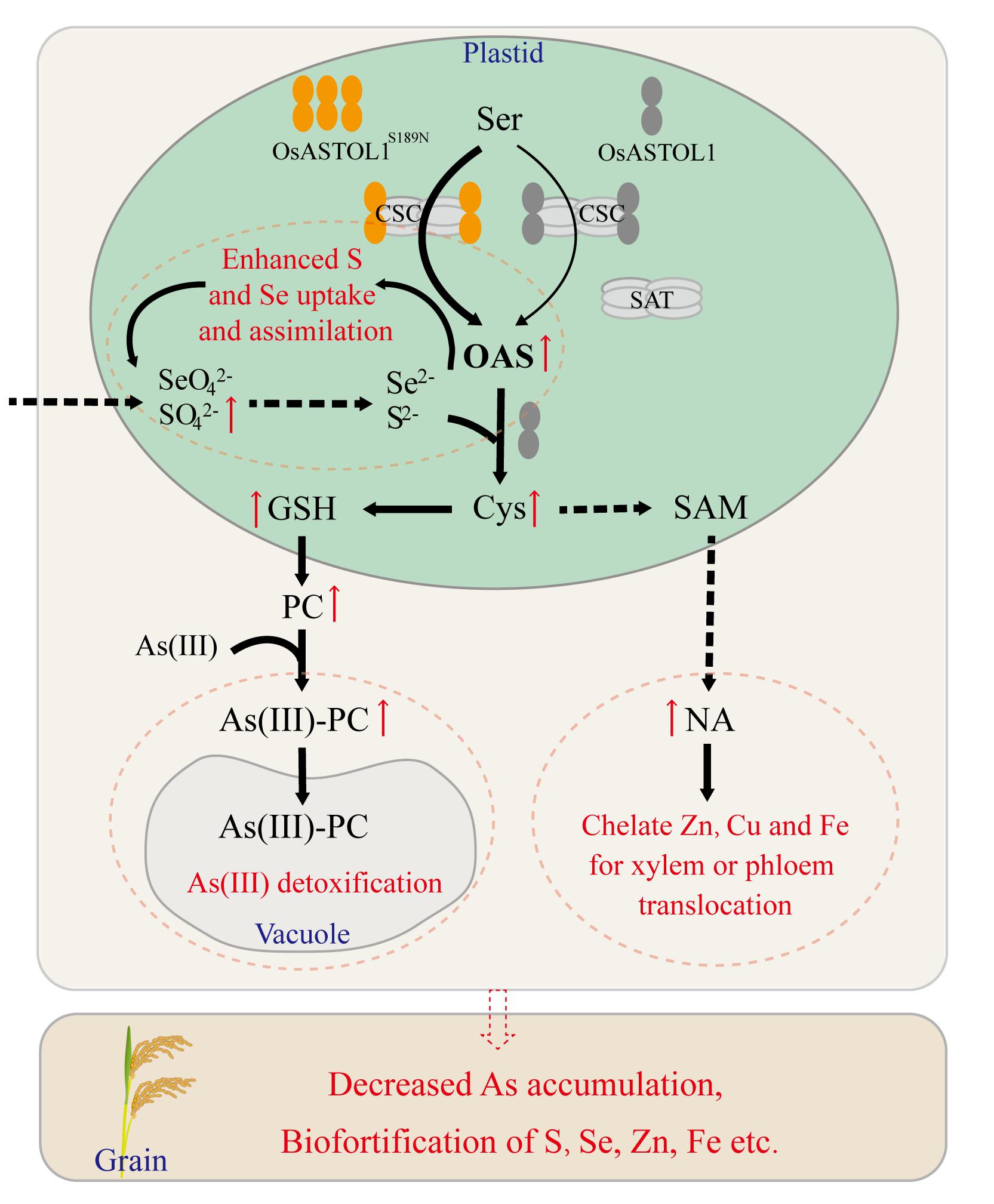 該實驗室先前的研究中發現了一個水稻質體定位的O-乙酰絲氨酸(硫醇)裂解酶(OAS-TL)突變等位基因(astol1),其編碼蛋白第189位氨基酸由絲氨酸突變為天冬酰胺,該蛋白通過增強半胱氨酸合酶復合體(CSC)的穩定性,從而增強半胱氨酸(Cys)的生物合成(Sun et al., 2021)。突變體對砷的耐性增強,而籽粒砷積累減少。然而由于純合突變體Cys的過度積累,導致生長受抑制,而雜合突變體在田間條件下生長正常,表明astol1的劑量效應需要與野生型等位基因相平衡。在本研究中,為了實現astol1增強Cys生物合成的潛力,同時克服其對水稻生長的抑制,采用了一個中等表達水平的線粒體谷胱甘肽過氧化物酶基因(OsGPX1)的啟動子來驅動astol1在野生型水稻中的表達。一系列的實驗結果表明,表達pOsGPX1::astol1可顯著促進硫的吸收和同化,根系中硫酸鹽轉運蛋白基因OsSULTR1;1和OsSULTR2;1表達水平升高,硫酸鹽含量增加,Cys合成的限速酶SAT活性顯著增強,O-乙酰絲氨酸(OAS)、Cys、谷胱甘肽(GSH)、植物螯合素(PCs)含量增加,耐砷能力增強。此外,根系中煙酰胺(NA)合成關鍵基因OsNAS的表達水平顯著提高,NA含量升高(圖1)。NA是微量元素Zn、Fe、Cu的螯合物,對植物體內這些元素向籽粒轉運起重要作用。