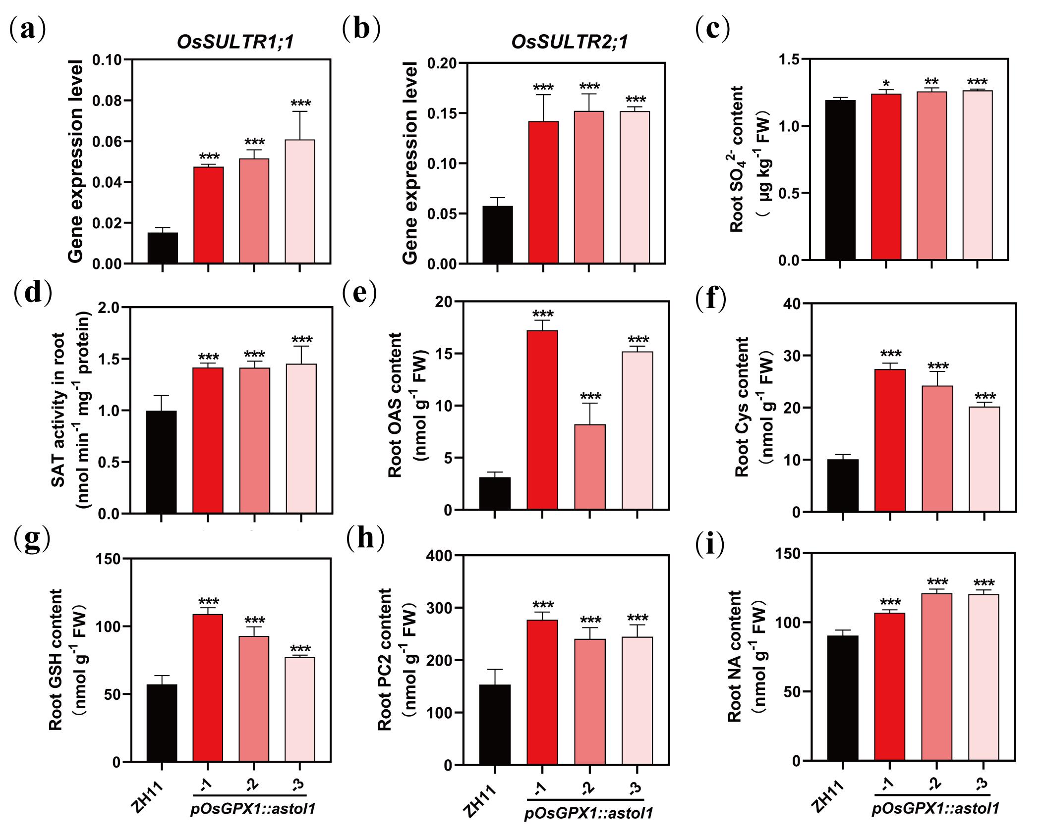 圖1 水培試驗中表達pOsGPX1::astol1對水稻硫吸收同化和煙酰胺合成的影響。(a, b) 野生型(ZH11)和pOsGPX1::astol1株系根系OsSULTR1;1(a)、OsSULTR2;1(b)的表達水平;(c-i) 野生型(ZH11)和 pOsGPX1::astol1株系正常培養條件下根系的硫酸鹽含量 (c)、總SAT酶活 (d)、OAS含量 (e)、Cys含量 (f)、GSH含量 (g),5 μM As(III)處理條件下根系的PC2含量 (h),正常培養條件下根系的NA含量 (i)。