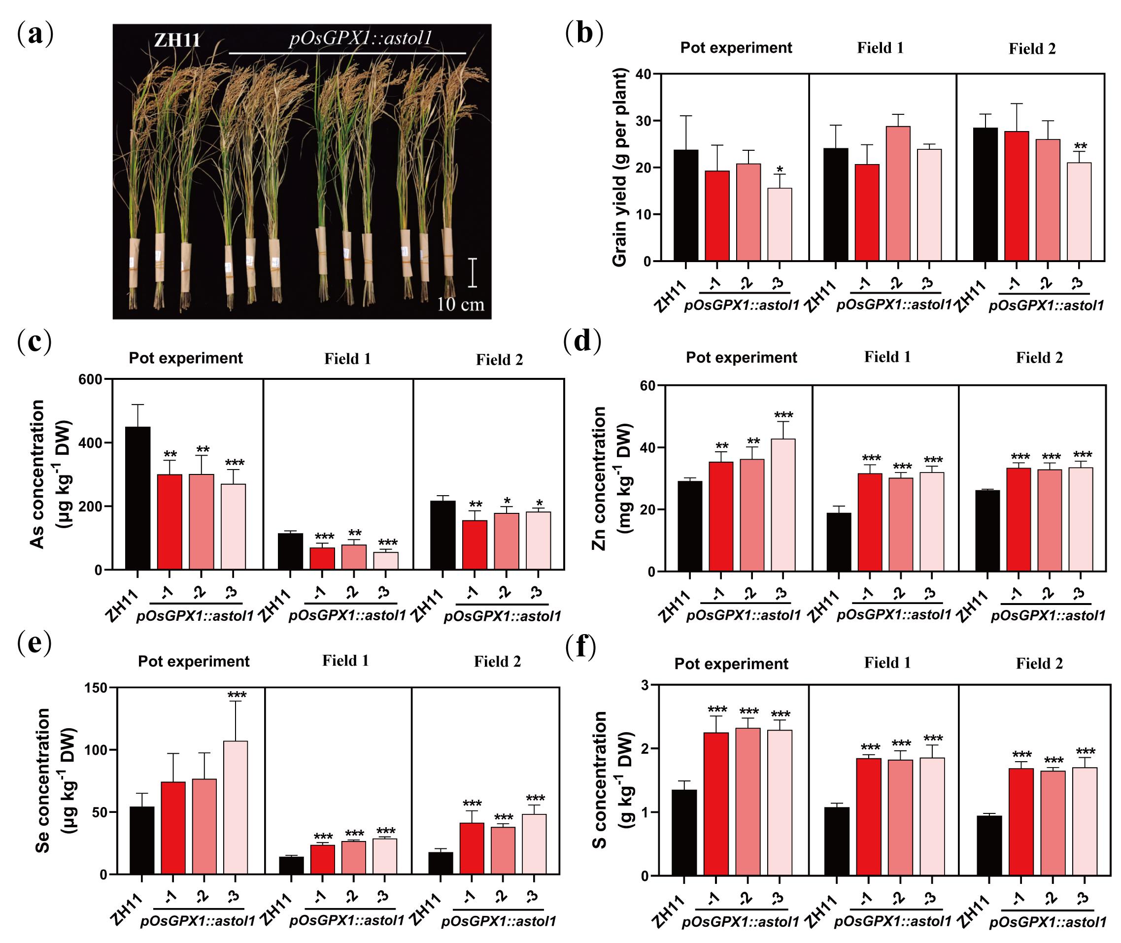 圖2 三種試驗條件下表達pOsGPX1::astol1對水稻生長和籽粒元素含量的影響。(a) 野生型(ZH11)和pOsGPX1::astol1株系在田間試驗的植株表型,(b) 單株籽粒產量;(c-f) 糙米中總As (c)、Zn (d)、Se (e)和S (f)的含量。