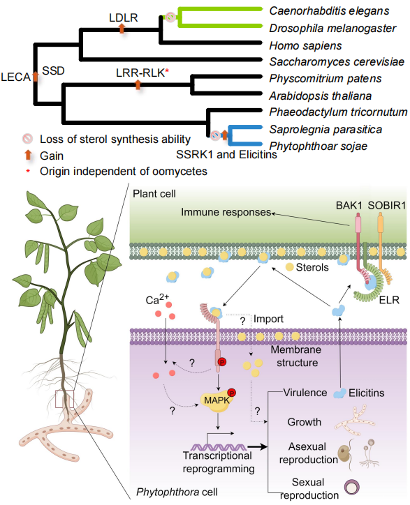 疫霉菌寄主范圍廣、破壞性強、危害大控制難,是一類重要的植物病原菌。疫霉菌基因組可塑性強,其致病分子演變速度快,常用的殺菌劑和抗性品種易被克服,迫切需要高效控制新策略。疫霉菌為甾醇異養生物,自身不能合成甾醇,從寄主獲取甾醇是其致病重要環節。病原菌甾醇合成途徑是藥物研發的重要靶標之一,對于甾醇異養型病原菌,這類藥物無效。但是甾醇異養型病原菌需要完成其生活史,勢必進化出強大的寄主甾醇感知與利用途徑,破解其中機制將是針對性研發疫霉菌高效殺菌劑的重要途徑之一。