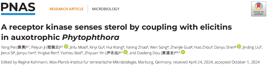 10月30日,南京農業大學植物保護學院竇道龍教授團隊破解疫霉菌感知利用寄主甾醇的獨特機制。相關文章“A receptor kinase senses sterol by coupling with elicitins in auxotrophic Phytophthora”發表在《PNAS》期刊。