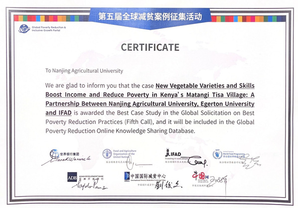 10月31日,由聯合國糧農三機構(聯合國糧食及農業組織、聯合國世界糧食計劃署、聯合國國際農業發展基金)及中國國際減貧中心等7家機構聯合主辦的2024減貧與發展高層論壇在北京舉行。本次論壇的平行論壇之一——“2024全球減貧伙伴研討會”發布了第五屆“全球減貧最佳案例征集活動”評選結果,我校申報的“新品種新技術助力肯尼亞納庫魯郡馬坦吉提薩村增收減貧-中國南京農業大學、肯尼亞埃格頓大學、國際農業發展基金多方協作案例”入選最佳案例,副校長朱艷代表學校參會并領獎。