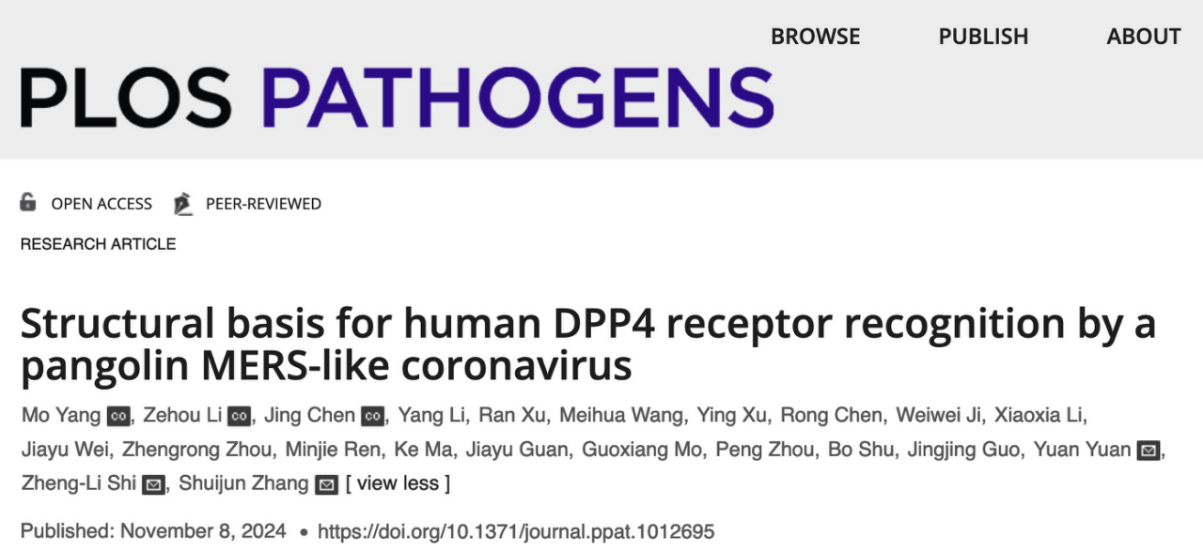 11月8日,《PLOS Pathogens》在線發表了題為《Structural basis for human DPP4 receptor recognition by a pangolin MERS-like coronavirus》(一株穿山甲MERS樣冠狀病毒識別人DPP4受體的結構基礎)的研究論文,報道了我校生命科學學院張水軍教授課題組、中國科學院武漢病毒研究所石正麗研究員團隊與安徽大學生命科學學院袁園副教授合作在穿山甲冠狀病毒(MjHKU4r-CoV-1)跨物種識別受體機制方面的研究成果。