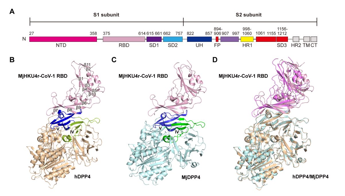 圖1 MjHKU4r-CoV-1RBD與人和穿山甲的DPP4復合物晶體結構示意圖
