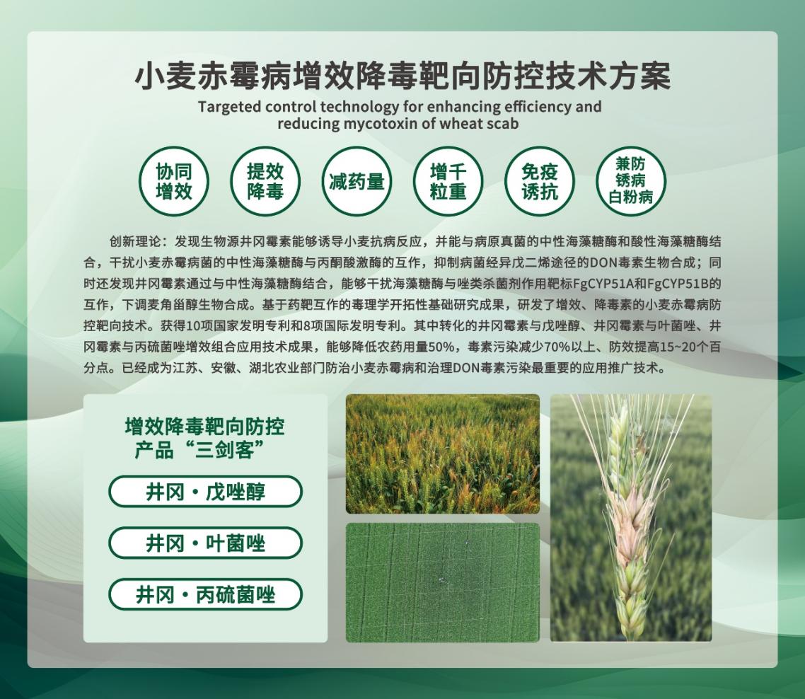 周明國教授與段亞冰教授團(tuán)隊的研究成果“小麥赤霉病增效降毒靶向防控技術(shù)”入選成果庫。該研究基于井岡霉素和唑類殺菌劑毒理學(xué)機(jī)制的基礎(chǔ)理論成果,研發(fā)了降低赤霉病菌毒素合成、兼治多種麥類作物病害、促進(jìn)小麥健康生長和增加千粒重等技術(shù)于一身的系列靶向抑制毒素和甾醇合成的生物-化學(xué)協(xié)同增效產(chǎn)品,是基礎(chǔ)理論研究與應(yīng)用技術(shù)研發(fā)緊密銜接的典型案例,解決了我國小麥病害防治技術(shù)單一、用工用藥成本高、抗藥性發(fā)生快、產(chǎn)品壽命短、市場競爭力低等問題,提升了我國麥類病害綜合防控的科技水平。目前該技術(shù)已獲得8項國際發(fā)明專利及10項國內(nèi)發(fā)明專利,成果轉(zhuǎn)化3項,進(jìn)入市場后將表現(xiàn)出極強(qiáng)的競爭力和較長的使用壽命,預(yù)計年均銷售額將突破億元,將成為江蘇及華東麥區(qū)示范推廣防控小麥赤霉病和控制毒素污染的關(guān)鍵技術(shù),在保障小麥生產(chǎn)安全、食品安全和環(huán)境安全方面具有重要的理論意義和應(yīng)用價值。