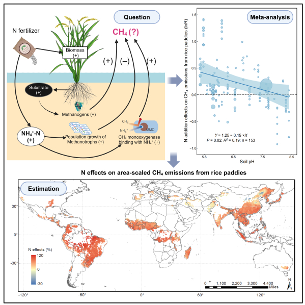 氮肥是影響糧食產(chǎn)量和溫室氣體排放的重要因素。然而,氮肥施用對(duì)稻田甲烷(CH4)排放的效應(yīng)依舊撲朔迷離,即正效應(yīng)、負(fù)效應(yīng)或無影響都常被報(bào)道,這嚴(yán)重影響了稻田CH4排放預(yù)測(cè)的準(zhǔn)確性和稻田減排策略的制定。