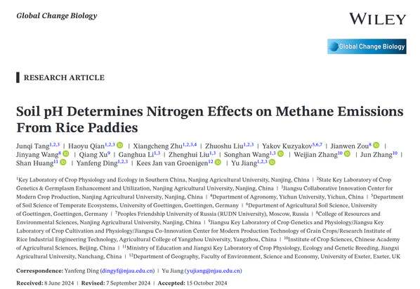 近日,南京農(nóng)業(yè)大學(xué)農(nóng)學(xué)院丁艷鋒教授團(tuán)隊(duì)在國(guó)際期刊《Global Change Biology》上發(fā)表了題為Soil pH determines nitrogen effects on methane emissions from rice paddies”的研究論文,發(fā)現(xiàn)稻田CH4排放對(duì)施氮的響應(yīng)受土壤pH調(diào)控,即施氮對(duì)稻田CH4的影響隨著土壤pH的增加而降低。