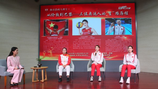 11月20日下午,2024年度體育思政大講堂暨團委信仰公開課在衛崗校區大學生活動中心開講。前中國田徑100米欄選手孫雅薇、中國女排國家隊主力二傳刁琳宇和巴黎奧運會花樣游泳冠軍王賜月三位運動員應邀來到現場與我校師生開展交流互動。