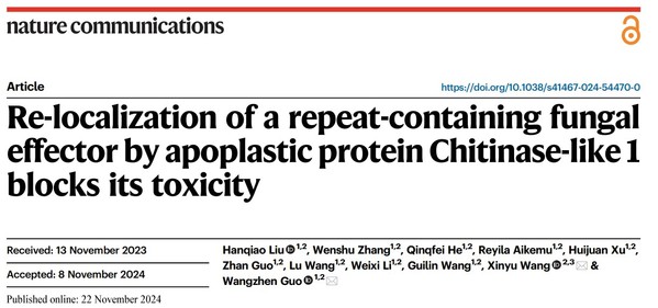 近日,南京農業大學棉花遺傳與種質創新利用團隊在國際著名學術期刊Nature Communications在線發表了題為“Re-localization of a repeat-containing fungal effector by apoplastic protein Chitinase-like 1 blocks its toxicity”的研究論文。該研究鑒定到一個具有獨特串聯重復DOMAIN的新型真菌毒性蛋白VdTRP并揭示了其致病機制;解析了棉花一個細胞壁關鍵蛋白類幾丁質酶CTL1在質外體與VdTRP互作,阻止VdTRP靶向細胞膜誘導細胞死亡的抗病機制;提出基于病菌毒蛋白的寄主互作靶標關鍵基因發掘及提高作物抗病性的育種利用策略。