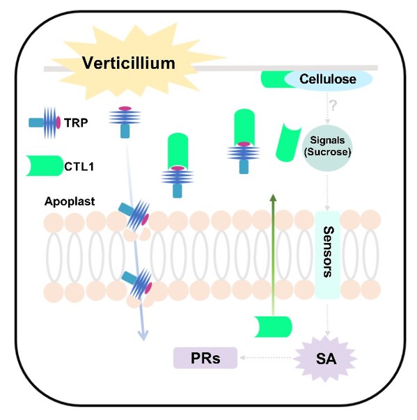 圖1. 質外體蛋白CTL1阻止新型毒蛋白VdTRP破壞細胞膜,誘導植株提高免疫,增強棉花對黃萎病抗性的工作模式圖