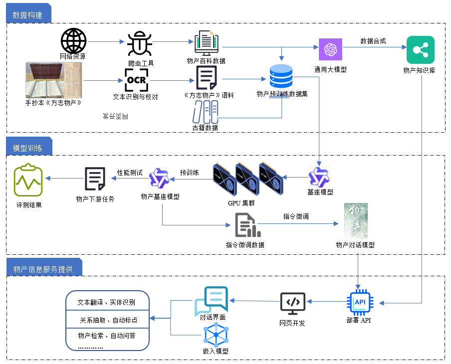 此次發布的中華物產大模型是一個集合了多家機構數據資源、算力資源和算法資源的系統工程。整體構建過程分為物產大模型預訓練語料構建、預訓練模型訓練、對話模型構建與知識庫問答實現三大板塊。