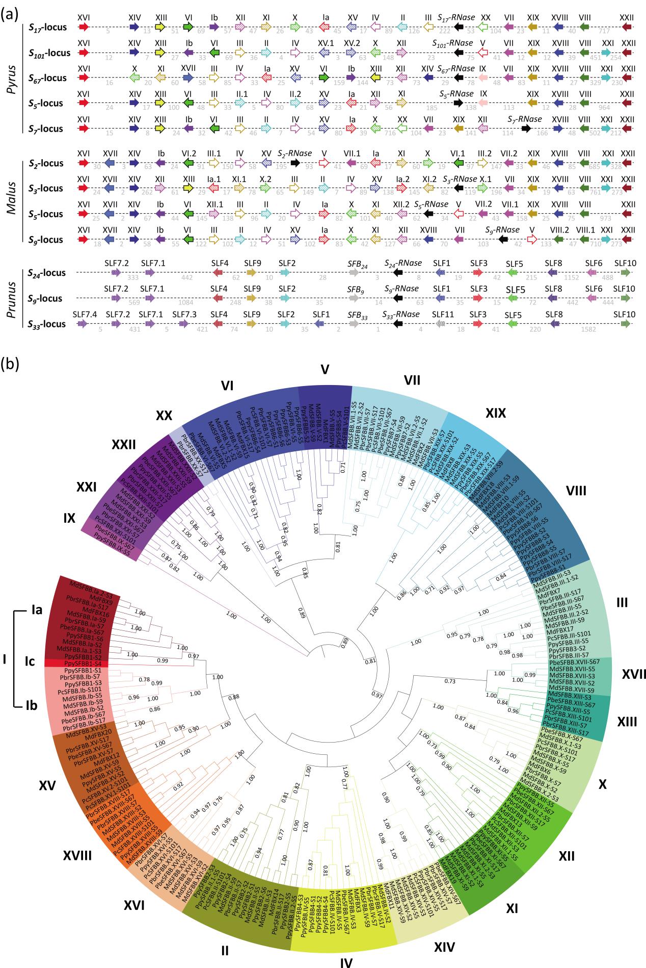 該研究使用梨SFBB保守序列,分別在梨屬和蘋果屬S位點共鑒定出17-21個SFBBs(圖1a)。基于梨屬和蘋果屬S單倍型基因的氨基酸序列,對177個SFBBs進行了系統發育分析,發現SFBBs被分為22個不同的組,I→XXII(圖1b)。每個組的氨基酸序列相似性平均值在88.9-97.9%之間,核苷酸相似性在92.1-98.4%之間,表現出了一定的序列多態性。盡管梨屬S17位點所有19個SFBBs均與S17-RNase遺傳連鎖,但PbrSFBBXXII-S17在花粉中不表達,而其它18個SFBB基因均在花粉中特異表達,說明這18個SFBB基因是潛在的花粉自交不親和性決定因子。