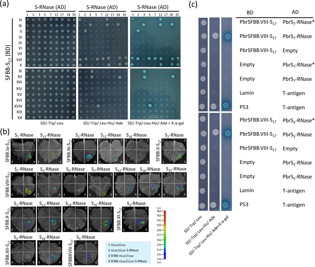 為探明SFBB和自我/非自我S-RNase之間的潛在相互作用,研究團隊通過酵母雙雜交(Y2H)和螢火蟲熒光素酶互補成像(FLCI)檢測,發現S17基因座中表達的SFBB均未與S17-RNase相互作用。相比之下,有8個SFBB與至少一種S-RNase相互作用(圖2a,b),從而支持了協作性非自我識別系統參與梨GSI的調控。進一步研究發現,移除高變區的S5-和S7-RNase不能與SFBB.VIII-S17互作(圖2c),表明高變區是梨S-RNase與非自我SFBB蛋白互作的重要區域。