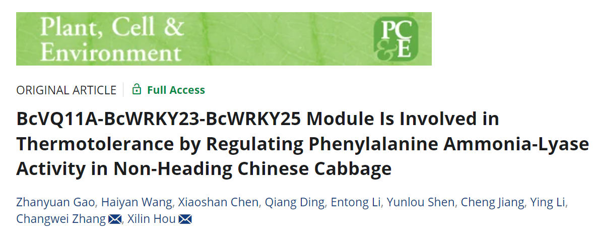 近日,Plant, Cell & Environment在線發表了南京農業大學園藝學院侯喜林教授團隊題為“BcVQ11A-BcWRKY23-BcWRKY25 module is involved in thermotolerance by regulating phenylalanine ammonia-lyase activity in non-heading Chinese cabbage”的研究論文,揭示了BcVQ11A-BcWRKY23-BcWRKY25模塊通過調節苯丙氨酸解氨酶活性參與不結球白菜耐熱性調控的新機制。