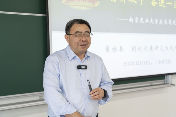 董維春一行首先看望慰問了海南專項研究生,并為同學們作了《躬耕雙甲 奮進一流-南京農業大學發展簡史》專題講座。董維春通過對南農歷史沿革的追溯和南農精神的解讀,從中國與世界近現代高等農業發展史的講解,再到現代大學農業教育體系的分析,讓同學們了解了南農躬耕雙甲的歷程和奮進一流的目標,深刻體會到作為南農人的自豪感。董維春希望同學們腳踏實地、苦練本領,以時不我待、勇往直前的闖勁和韌勁,勇擔強農興農使命。講座結束后,董維春、林江輝與同學們進行了座談交流,解答了同學們在瓊學習與學校銜接交流方面遇到的問題。