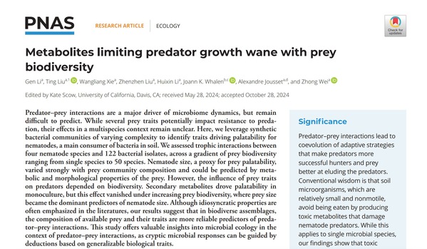 近日,南京農業大學資源與環境科學學院揭示了微生物多樣性如何塑造捕食者體型大小的生態學機制,挑戰了傳統微型生態系統中捕食-被捕食關系以毒性為主導的假說。相關成果以題為“Metabolites limiting predator growth wane with prey biodiversity”發表在國際權威期刊《PNAS》(www.pnas.org/doi/10.1073/pnas.2410210121)。