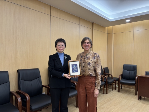 Pamela Ronald感謝學校授予獎項,這是對她數十年以來科研和推廣工作的肯定。同時,她對兩校間的合作成果表示高度贊賞,特別是水稻遺傳育種團隊取得的成就,期待未來能夠充分整合兩校的教學和科研優勢資源,進一步拓寬合作領域,開啟高水平合作新篇章。農學院、國際合作與交流處(港澳臺辦公室)、國際教育學院(密西根學院)相關負責人參加會談。
