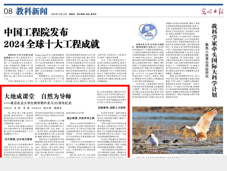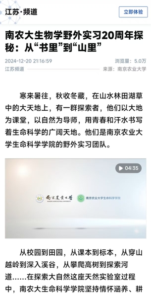 南京農(nóng)業(yè)大學(xué)深入貫徹落實(shí)立德樹(shù)人根本任務(wù),聚力培養(yǎng)知農(nóng)愛(ài)農(nóng)新型人才,涌現(xiàn)出一批值得書(shū)寫(xiě)的案例故事。光明日?qǐng)?bào)、新華社客戶(hù)端相繼刊發(fā)專(zhuān)題報(bào)道,聚焦我校生物學(xué)野外實(shí)習(xí)20周年,如何以大地為課堂、以自然為導(dǎo)師,深化學(xué)生情懷涵育,推進(jìn)具有學(xué)科特色的實(shí)踐創(chuàng)新人才培養(yǎng)。