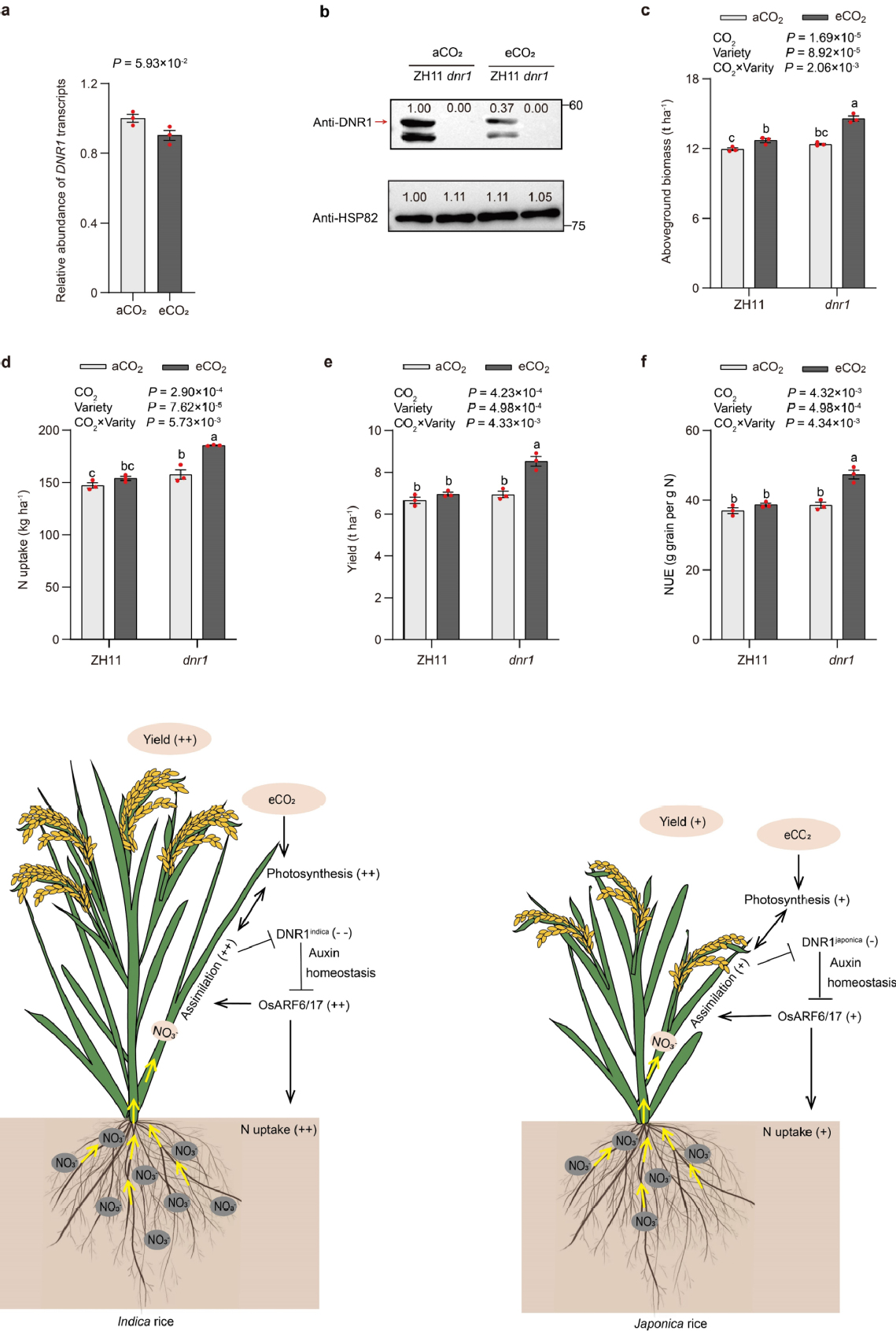 為了驗證這一假設,在FACE平臺利用DNR1近等基因系和突變體開展田間試驗發現,攜帶秈稻DNR1(硝態氮吸收高)水稻在大氣CO2濃度升高下產量增幅達到22.8–32.3%,但攜帶粳稻DNR1(硝態氮吸收低)水稻的產量僅增加3.6–11.1%。其機制是:在攜帶秈稻DNR1的植株中,大氣CO2濃度升高大幅降低了DNR1的積累,合成了更多生長素,招募了更多的OsARF6和OsARF17,上調了參與硝態氮代謝相關基因的表達(OsNRT1.1B、OsNRT2.3a、OsNIA2和OsNPF2.4),增加了對硝態氮的吸收和同化,從而大幅增強了葉片光合基因(OsPsaB、OsRbcs和OsSBPase)的表達和光合速率。研究結果證實了秈稻對大氣CO2濃度升高的響應更高與硝態氮吸收能力更強有關,秈稻DNR1基因可作為提高粳稻產量和氮肥利用效率的關鍵育種資源,尤其是在大氣CO2濃度持續升高的背景下。