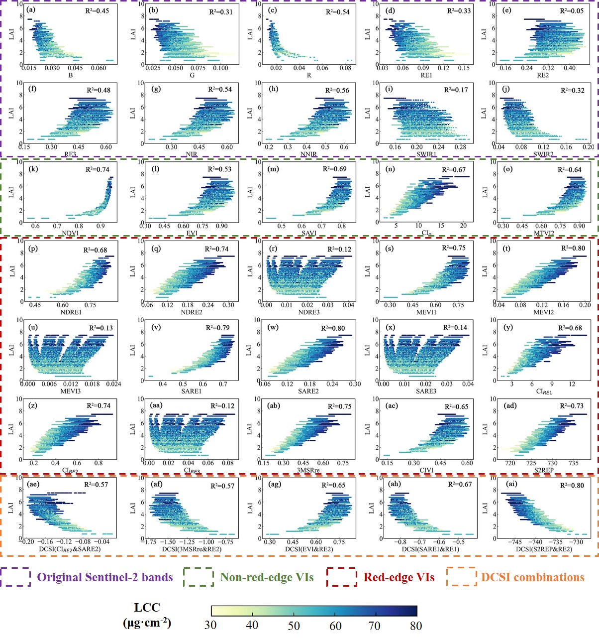 該研究首先闡明LCC變化的光譜效應(yīng)是導(dǎo)致紅邊VI-LAI模型推廣過程中普適性差的主要原因之一。隨后,提出光譜指數(shù)差值組合算法(Difference combination of spectral index, DCSI)來組合紅邊植被指數(shù),同時緩解LCC變化的光譜效應(yīng),并且優(yōu)選最佳的植被指數(shù)組合用于不同LCC條件下小麥LAI的估算。最后,衍生出一個適用于大尺度LAI估算的新紅邊植被指數(shù),命名為基于Sentinel-2的改良紅邊位置(Sentinel-2 modified red-edge position, S2MREP)。