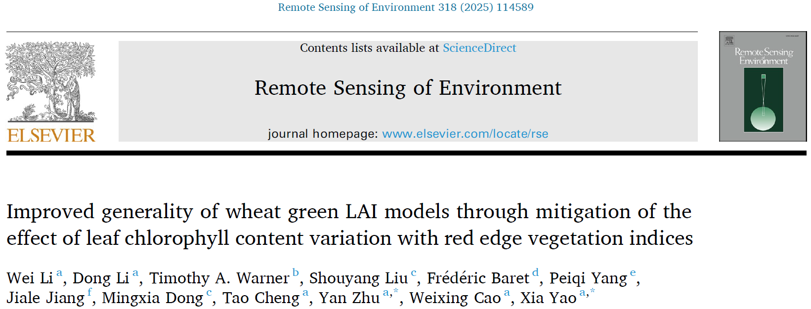 近年來,南京農(nóng)業(yè)大學(xué)農(nóng)學(xué)院智慧農(nóng)業(yè)團隊對大尺度小麥葉面積指數(shù)衛(wèi)星遙感監(jiān)測進行了深入研究。研究結(jié)果以 “Improved generality of wheat green LAI models through mitigation of the effect of leaf chlorophyll content variation with red edge vegetation indices”為題,發(fā)表在國際著名頂級遙感期刊《Remote Sensing of Environment》。