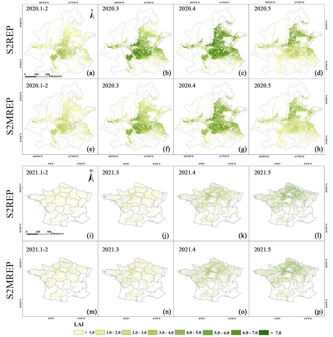 結(jié)果表明,利用DCSI算法得到的植被指數(shù)組合,能夠有效地緩解LCC變化的影響,具有更高的穩(wěn)定性(圖1);相比于歐空局(European Space Agency, ESA)目前采用的Sentinel-2紅邊位置指數(shù)(Sentinel-2 red-edge position, S2REP),本研究新構(gòu)建的S2MREP指數(shù)模型預(yù)測小麥LAI的精度更高,并且在不同年份、不同生態(tài)點具有較高的普適性;本研究構(gòu)建的小麥LAI模型還具有較好的遷移性,適用于我國小麥主產(chǎn)區(qū)和法國等其他國家的大尺度LAI空間分布圖的生產(chǎn)(圖2)。