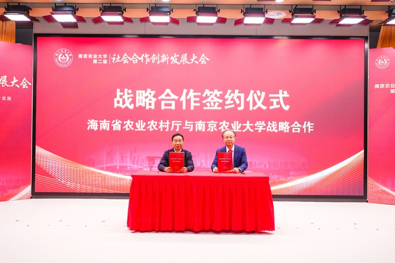 大會舉行合作簽約儀式。南京農業大學與海南省農業農村廳進行戰略合作簽約,與浙江托普云農科技股份有限公司、湖北佳瑪馳生態農業有限公司、江蘇加德華農業科技研究院有限公司、安佑生物科技集團有限公司、江蘇叁拾叁信息技術有限公司等5家企業進行產學研合作簽約。