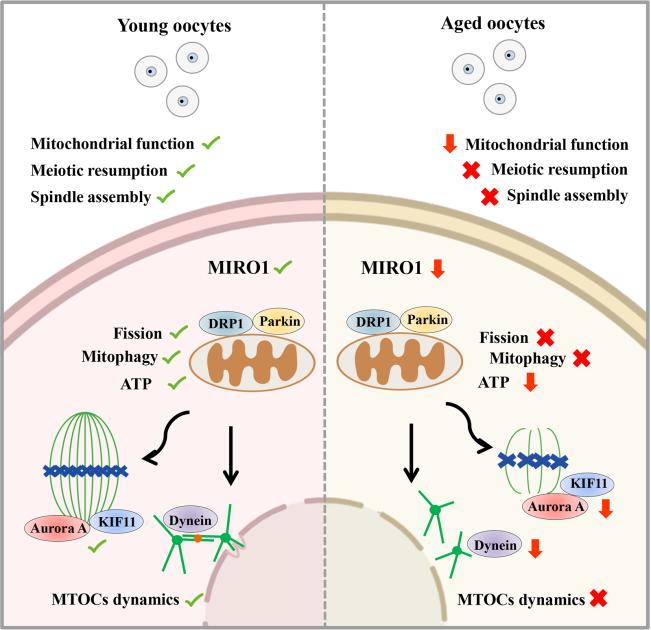 本研究發現MIRO1在豬卵母細胞成熟過程中均有表達,且定位在線粒體附近。在豬卵母細胞中破壞MIRO1活性引起極體排出失敗,初步結果發現豬卵母細胞GV期和MI期微管的組裝受到影響,MI期線粒體分布異常。進一步研究發現在高齡卵母細胞中MIRO1表達降低,暗示老化卵母細胞質量下降與MIRO1功能失調有關。進一步采用模式動物研究相關調控機制,發現MIRO1缺失引起的卵母細胞成熟缺陷可以通過注射外源性MIRO1 mRNA挽救。質譜數據表明MIRO1與多種微管和線粒體相關蛋白有關。在卵母細胞生發泡時期,MIRO1通過調節Dynein介導的MTOC動力學影響后續減數分裂恢復;在卵母細胞第一次減數分裂中期,MIRO1通過調節Aurora A和驅動蛋白KIF11影響卵母細胞減數分裂紡錘體組裝。此外,免疫共沉淀實驗發現MIRO1與線粒體相關蛋白DRP1結合調節卵母細胞線粒體分裂、與Parkin和LAMP2互作進而促進線粒體自噬。