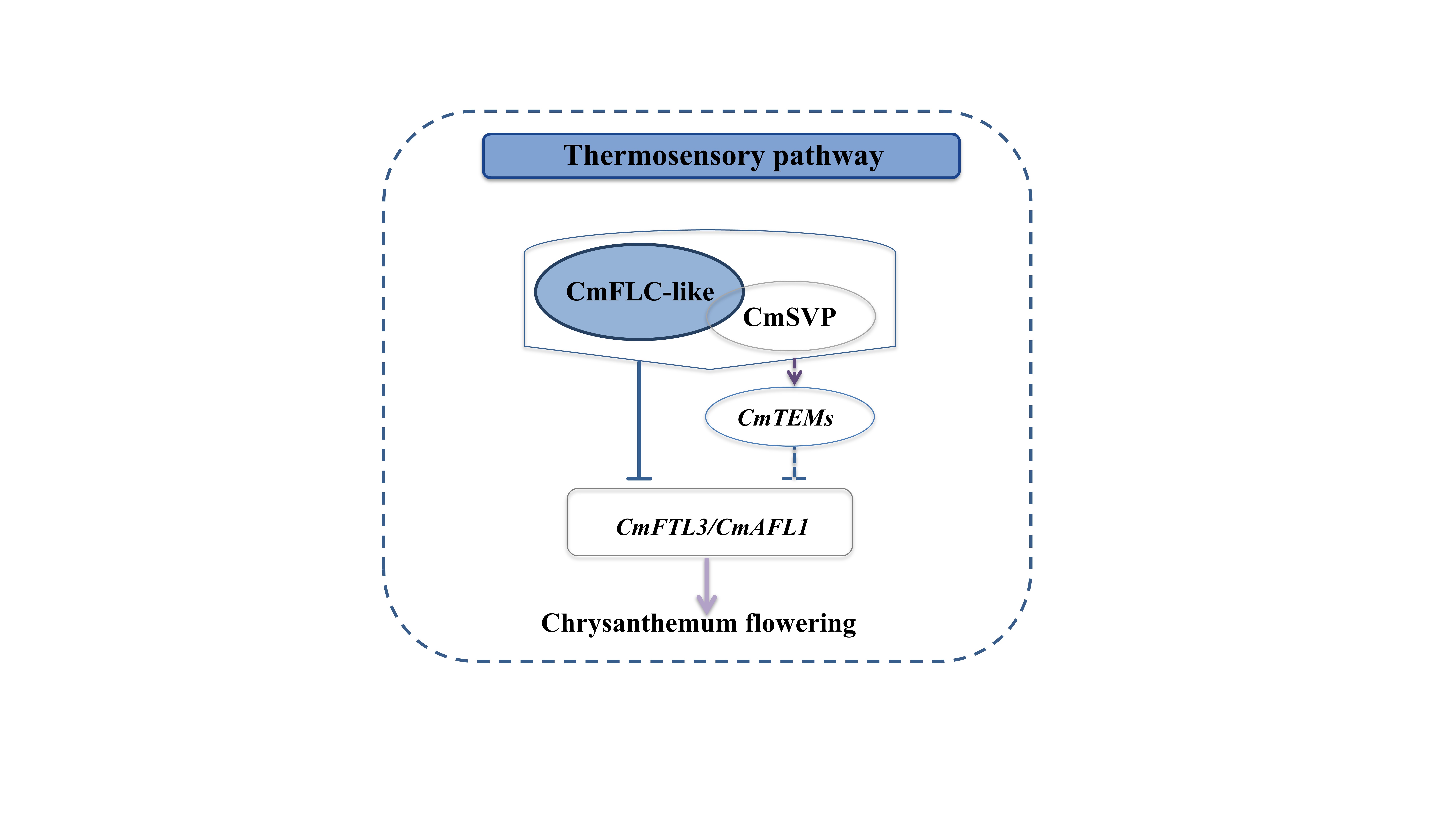此外,研究發(fā)現(xiàn)CmFLC-like與CmSVP互作,并且CmFLC-like部分依賴CmSVP抑制CmFTL3的表達(dá),介導(dǎo)菊花的成花轉(zhuǎn)變。綜上所述,該研究揭示了CmFLC-like介導(dǎo)溫敏路徑抑制開花的分子機(jī)制(圖2),研究結(jié)果為深入理解低溫調(diào)控菊花開花提供了新的認(rèn)知。