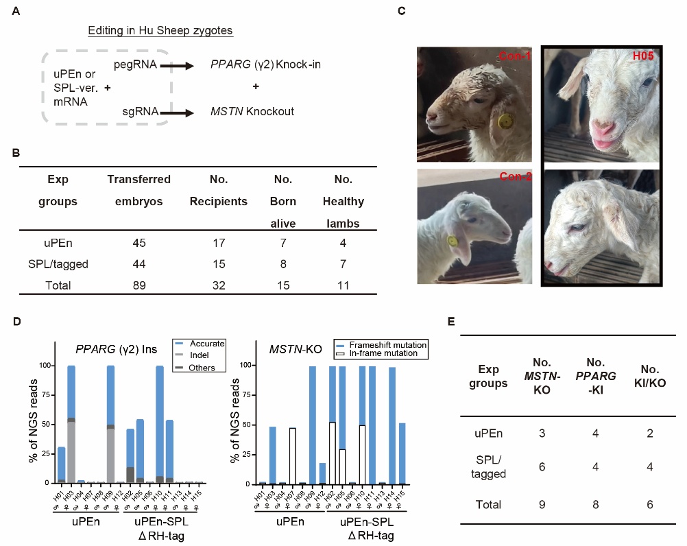 接下來,研究人員在湖羊受精卵中用全長或拆分uPEn,分別針對PPARG基因進行Kozak基序敲入,同時靶向敲除MSTN基因。基因型分析結果顯示,uPEn在PPARG處有效地敲入了Kozak基序(8/15羔羊,每只編輯羔羊的正確編輯率的中位數為50.11%),并且6只羔羊同時達成了雙基因編輯(6/15),進一步證實了uPEn工具在多位點基因編輯中的強大靈活性。