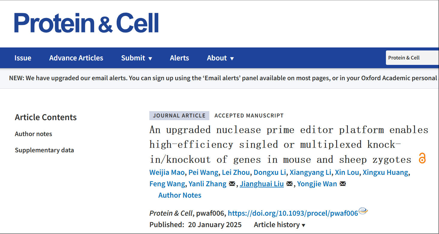 近日,南京農業大學江蘇省家畜胚胎工程研究中心/動物科技學院肉羊創新團隊萬永杰教授和張艷麗教授課題組在Protein & Cell期刊在線發表了題為“An upgraded nuclease prime editor platform enables high-efficiency singled or multiplexed knock-in/knockout of genes in mouse and sheep zygotes”的研究成果。該研究在基因編輯技術研究領域取得重要進展,成功利用升級后的核酸酶先導編輯器(uPEn)在湖羊中實現MSTN/PPARG雙基因高效編輯,為畜禽基因編輯育種提供了新的技術手段。