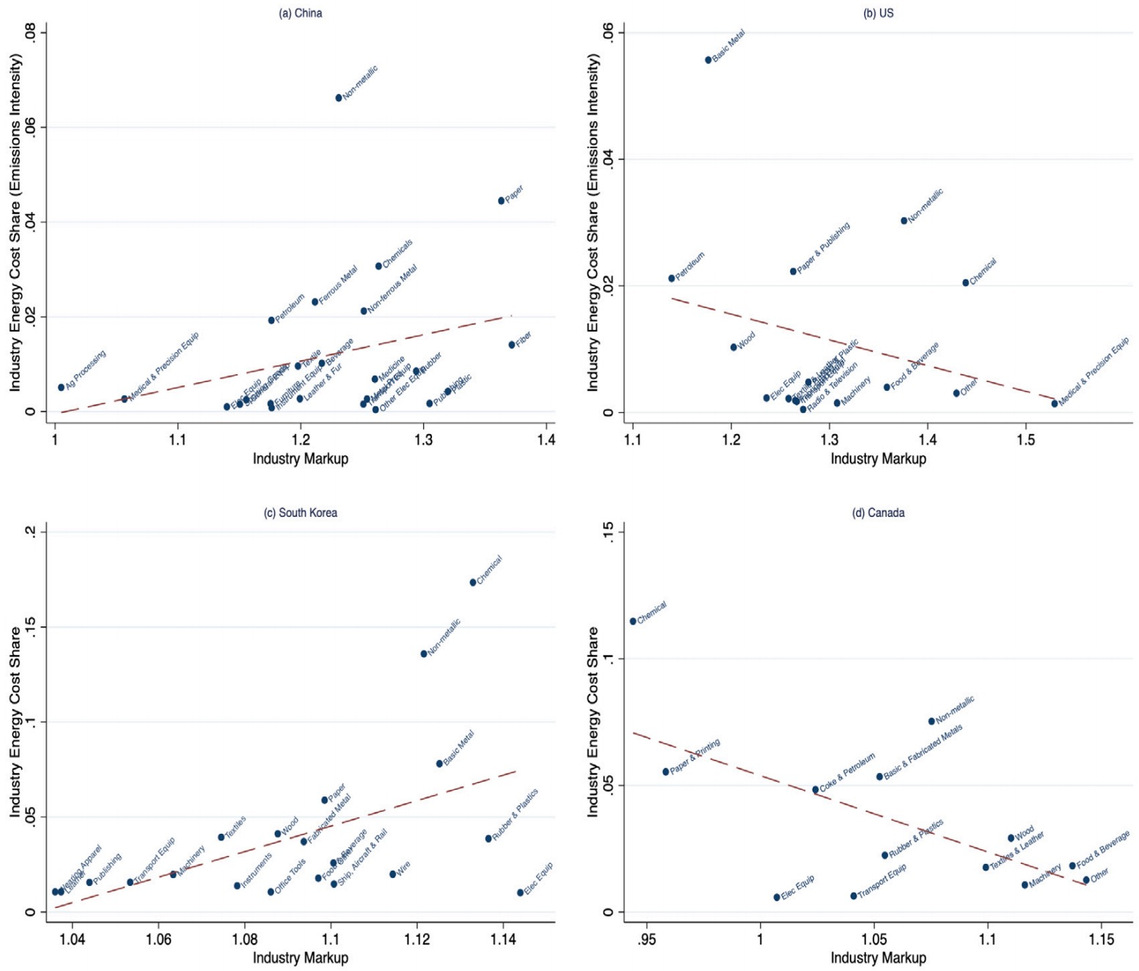 李昊洋教授表示消費者對于不同行業產品的差異化偏好和行業國際貿易參與度之間的差異通常導致行業之間的市場勢力強弱存在顯著差異。次優環境規制理論認為,由于市場勢力較高的行業通常較低(以此獲取壟斷利潤),激勵這些行業提高產量對社會有益。因此,對這些行業的環境規制應適當放松。另一方面,在現實中,出于公平性考量,環境政策通常僅覆蓋排污量最高的部分行業。如,歐盟與中國兩大碳排放許可證交易市場都只覆蓋了二氧化碳排放量最高的部分行業。然而,以制造業行業為例,如下圖所示,行業排污強度與行業的市場勢力之間通常存在顯著的相關性。此時,若較清潔的行業具有較高的市場勢力,環境規制通過引導生產要素從污染較重的行業流向清潔行業,緩解不完全競爭所帶來的成本扭曲。