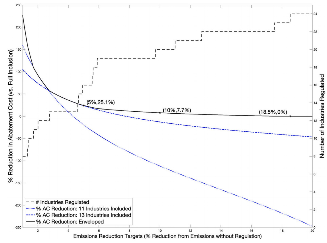 基于以上背景,李昊洋教授構建了一個包含異質性產業的一般均衡模型。基于這一模型,文章從理論上推導了社會邊際減排成本的表達式,并研究得出被規制的行業間市場勢力與排污強度的協方差是減排成本的重要影響因素。選擇哪些行業規制取決這一相關性,而非簡單依據排放量大小選?。划敎p排目標適中時,覆蓋部分行業的環境規制可能優于全行業覆蓋。本文將該模型應用于中國的環境規制實踐,結果表明,相較于全行業覆蓋,僅規制部分行業可顯著降低減排成本。