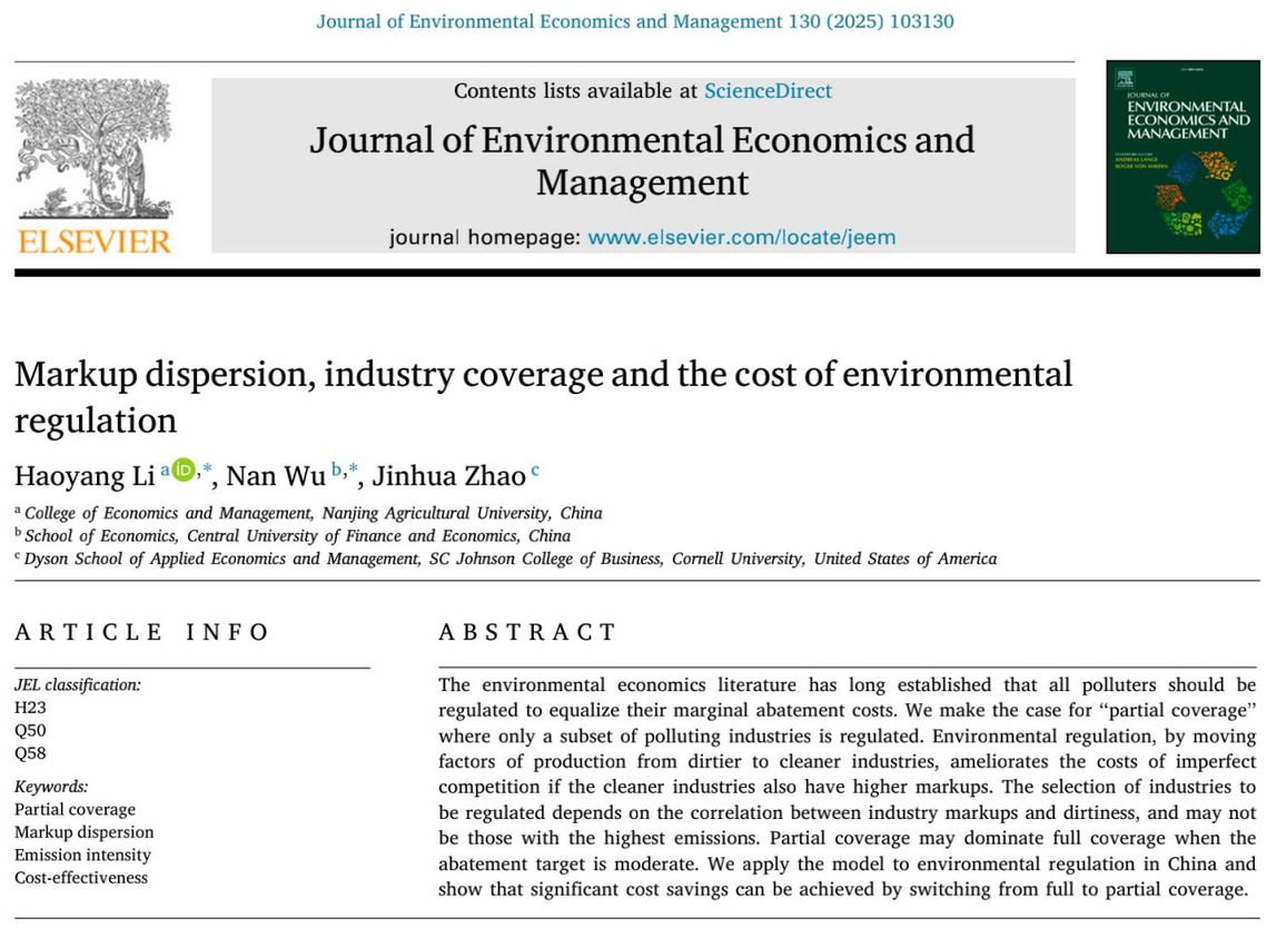 近日,經濟管理學院李昊洋教授(第一作者)、中央財經大學吳楠、康奈爾大學Jinhua Zhao教授的合作論文“Markup dispersion, industry coverage and the cost of environmentalregulation” 發表于Journal of Environmental Economics and Management(JEEM)上。