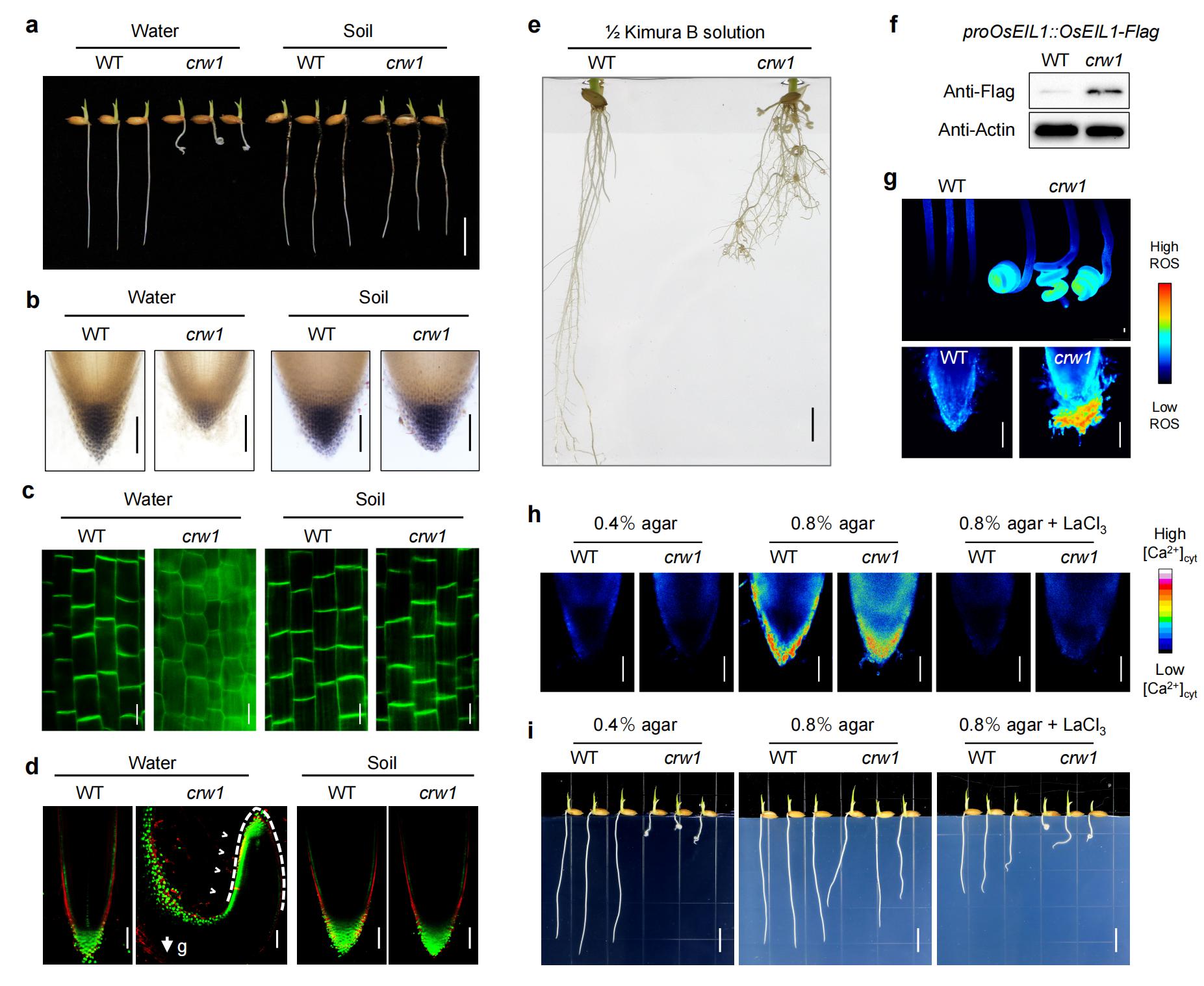a-d.crw1突變體在水培和土培條件中的(a)根系表型、(b)根冠、(c)OsPIN2蛋白極性定位和(d)根尖生長素分布;(e)異常的向地性機(jī)制導(dǎo)致crw1在營養(yǎng)液中根系持續(xù)卷曲生長;f-g.增強(qiáng)的乙烯激活信號(hào)通過ROS導(dǎo)致crw1根系在水培中卷曲生長;(f)OsEIL1蛋白在crw1根中積累;(g)crw1根尖ROS增強(qiáng);h-i. crw1在0.4%和0.8%瓊脂中(±鈣信號(hào)抑制劑LaCl3)生長時(shí)的(h)根冠鈣信號(hào)和(i)根系表型。