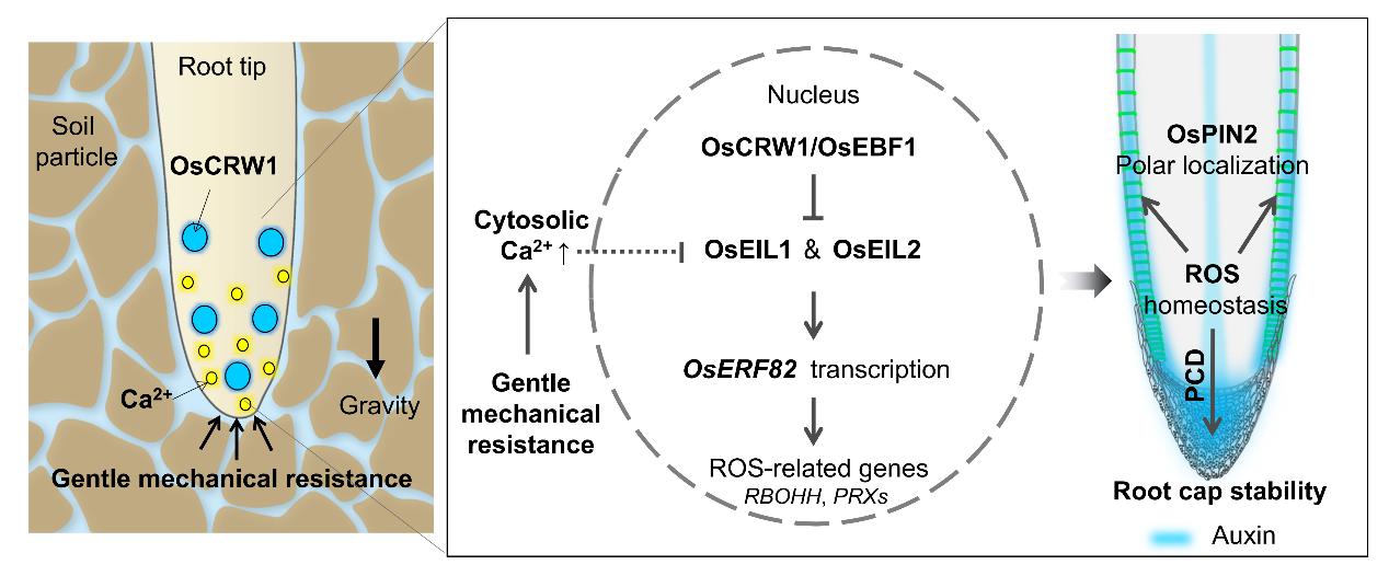 綜上所述,本研究揭示了OsCRW1(OsEBF1)和根冠機(jī)械力感應(yīng)通過抑制OsEIL1/OsEIL2-OsERF82-ROS信號(hào)模塊對(duì)維持根冠結(jié)構(gòu)穩(wěn)定和根尖生長素分布起重要作用,OsCRW1和機(jī)械力-鈣信號(hào)提供了限制乙烯激活信號(hào)放大的雙重保險(xiǎn),確保水稻根系的向地性生長(圖2)。