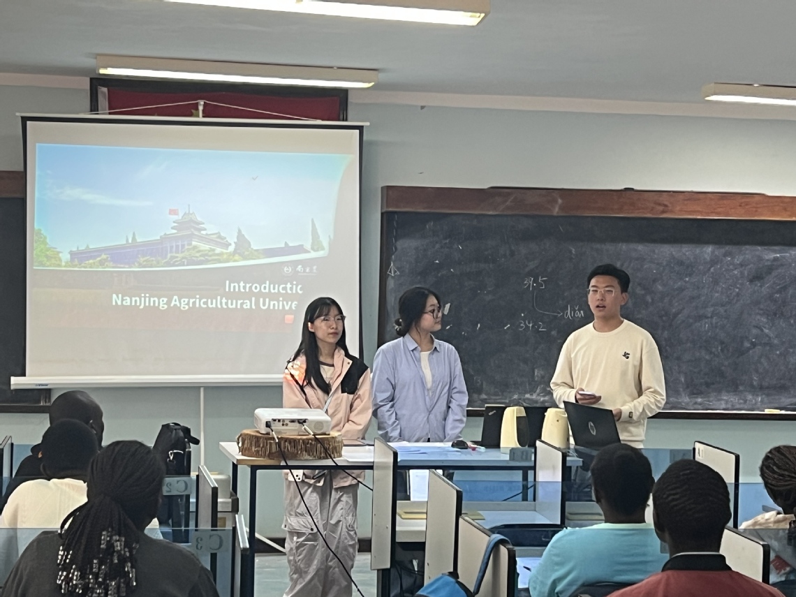 在孔子學(xué)院語言文化中心,代表團成員以“耕讀南農(nóng)·青春同行”為主題展開匯報交流。代表團同學(xué)從南農(nóng)的悠久歷史引入,以圖文并茂的形式,從學(xué)習(xí)體驗、實踐活動和校園文化等方面生動呈現(xiàn)南京農(nóng)業(yè)大學(xué)的校園風(fēng)貌。在交流的過程中,團隊特別介紹了學(xué)校“農(nóng)業(yè)特色+國際視野”的培養(yǎng)模式,為非洲學(xué)生“留學(xué)南農(nóng)-回國實踐”的全鏈條成長提供路徑參考。交流尾聲,中肯學(xué)生圍繞中肯文化差異、未來合作發(fā)展等主題展開討論,繪制合作藍圖。