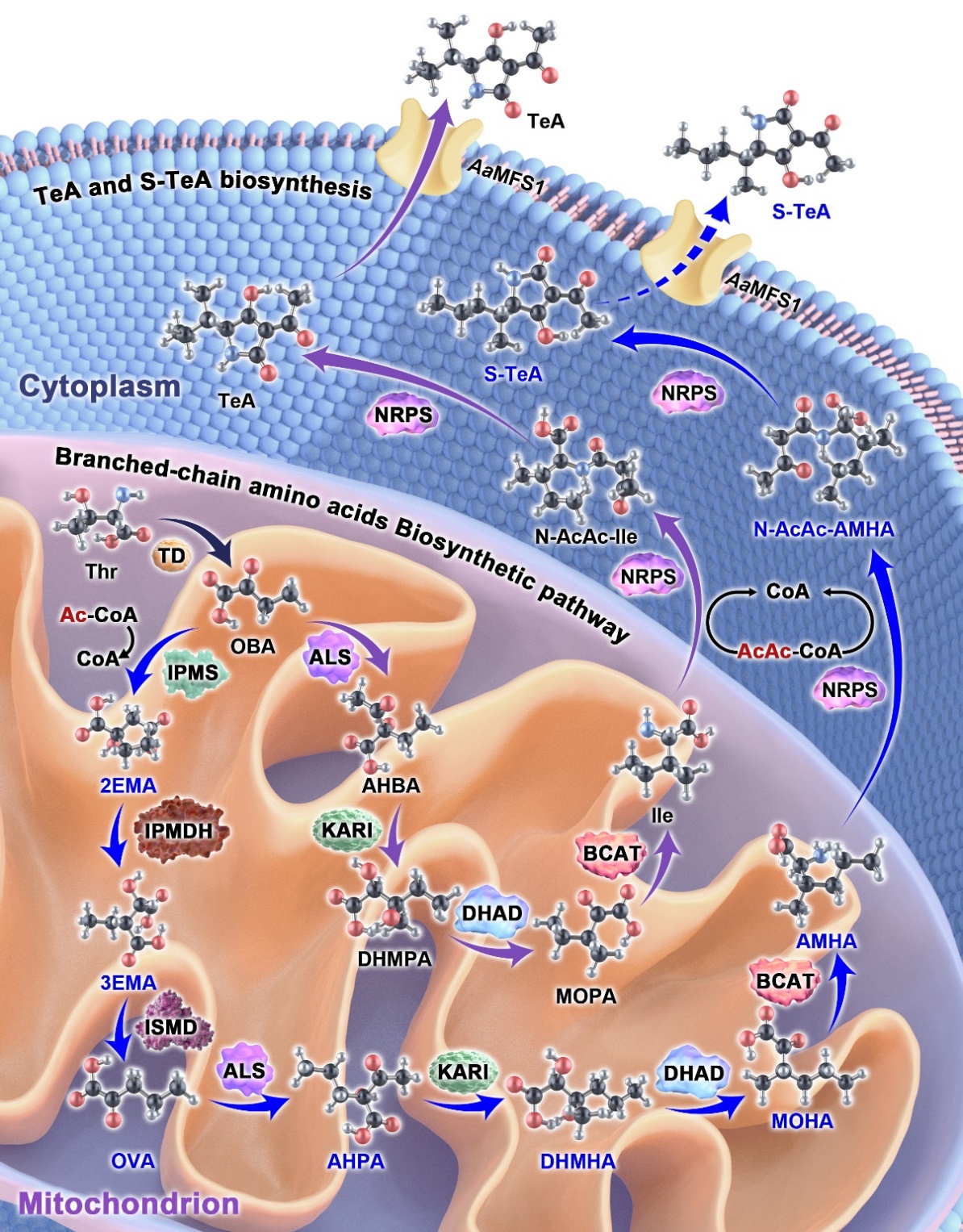 同時,本研究利用多組學、同位素示蹤、質譜、蛋白重組等手段明確了S-TeA是以蘇氨酸為起始原料,先通過支鏈氨基酸合成途徑中8個酶在線粒體中合成直接前體AMHA(2-氨基-3-甲基己酸),隨后AMHA在細胞質中被NRPS-PKS(非核糖體肽合成酶-聚酮合酶)乙酰化和環化形成S-TeA,最后通過跨膜蛋白AaMFS1將S-TeA排到胞外的合成機制。其中,2-異丙基蘋果酸合成酶(IPMS),3-異丙基蘋果酸脫水酶(IPMDH)和異丙基蘋果酸脫氫酶(ISMD)是AMHA生物合成途徑特有的酶,而IPMDH是關鍵限速酶。AMHA已經被證實是一種天然發生的非蛋白氨基酸,具有抗逆、促生、提質、緩解藥害等功能,已獲得多項發明專利授權和新農藥命名“氨甲己酸”,有潛力開發成我國具有完全自主知識產權的植物誘抗劑新產品。本研究對真菌中AMHA生物合成途徑及機制的解析,為基于合成生物學構建AMHA高產工程菌株、實現其高效生物制造奠定了堅實的理論基礎。