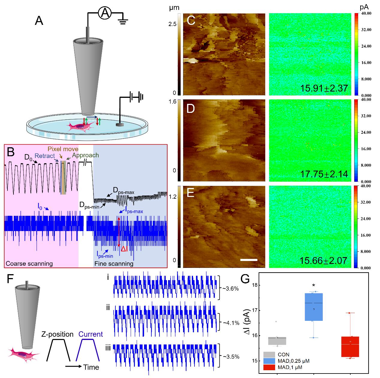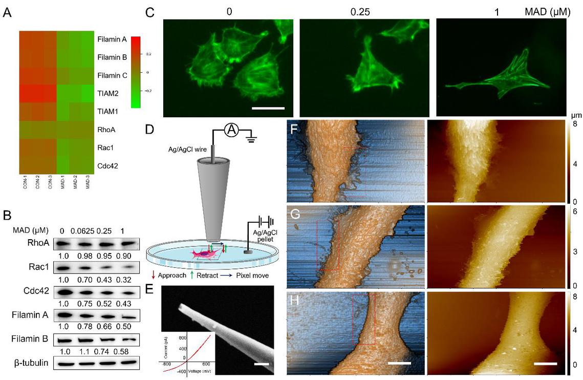 研究表明,MAD能夠顯著抑制三陰性乳腺癌細(xì)胞的遷移和侵襲能力。通過SICM高分辨率成像,團(tuán)隊(duì)觀察到MAD處理后的細(xì)胞表面形態(tài)發(fā)生明顯改變:細(xì)胞面積縮小、膜結(jié)構(gòu)收縮、邊界平滑化,同時(shí)細(xì)胞表面電荷分布也呈現(xiàn)顯著變化。進(jìn)一步研究發(fā)現(xiàn),這種變化與鈣離子通道活性的調(diào)控密切相關(guān),揭示了細(xì)胞電生理特性與腫瘤細(xì)胞行為之間的內(nèi)在聯(lián)系。