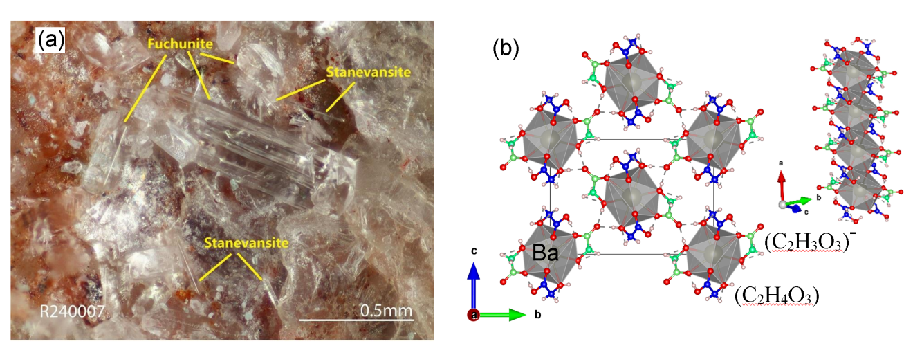 自然界的乙醇酸多來(lái)源于植物根系的分解,乙醇酸鹽礦物的形成及保存對(duì)自然界的固碳作用具有重要的指示意義。自楊和雄博士發(fā)現(xiàn)第一個(gè)銅乙醇酸鹽礦物—Lazaraskeite(拉扎石)并于2022年被國(guó)際礦物學(xué)會(huì)批準(zhǔn)為新礦物以來(lái),已陸續(xù)發(fā)現(xiàn)鈣、鎂、鈉、鋅和銨等的乙醇酸鹽礦物,建立并逐步豐富了乙醇酸鹽礦物族,福春石是該礦物族的最新成員。福春石含有的兩種有機(jī)分子—乙醇酸根(C2H3O3)-和乙醇酸分子(C2H4O3)圍繞Ba2+形成Ba(C2H3O3)2(C2H4O3)4配位多面體并共邊鏈接形成平行a軸的鏈狀構(gòu)造(圖b)。福春石以其獨(dú)特的化學(xué)組成和晶體結(jié)構(gòu),可成為探索土壤微生物—植物根系—重金屬離子之間的相互作用及其環(huán)境效應(yīng)的重要實(shí)例。