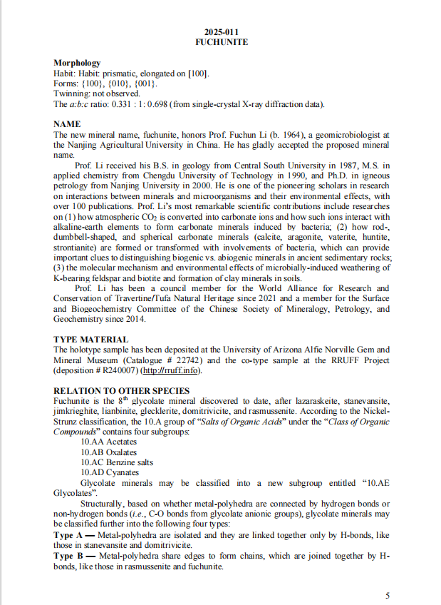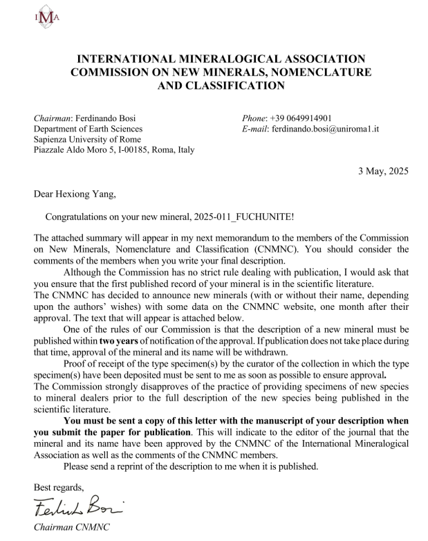 近日,國(guó)際礦物學(xué)會(huì)新礦物命名及分類(lèi)委員會(huì)(IMA-CNMNC)主席F. Bosi簽發(fā)了由美國(guó)亞利桑那大學(xué)華人學(xué)者楊和雄博士和江西應(yīng)用科技學(xué)院谷湘平教授等申報(bào)的新礦物Fuchunite(中文名:福春石)的批準(zhǔn)書(shū)(編號(hào)IMA-2025-011)。