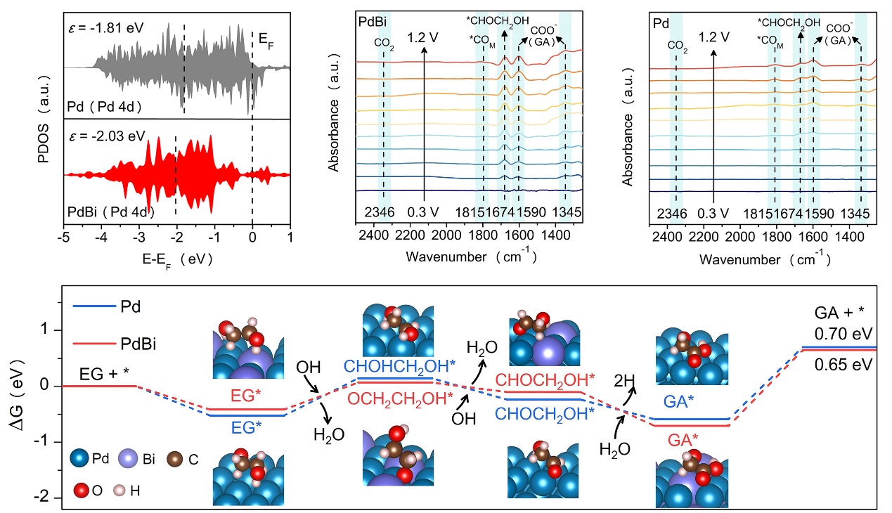 本研究提出了一種配對電解工藝概念,通過陽極塑料衍生乙二醇氧化與陰極生物質衍生草酸還原耦合以實現高附加值化學品乙醇酸的聯產。該工藝通過開發具有強CO耐受性的PdBi合金陽極和溫度響應型TiO?陰極得以實現,通過理論計算與實驗研究闡明了其作用機制:合金化策略使Pd的d帶中心下移,削弱了毒化物種在活性位點的過度鍵合,顯著提升乙二醇氧化生成乙醇酸反應的活性與穩定性。同時,TiO?陰極通過溫度調控(70°C)抑制了中間體乙醛酸的解吸,促進其深度還原為乙醇酸。在70?°C下構建的雙電極體系中,該配對系統實現了乙醇酸總法拉第效率達182%。本研究為塑料和生物質廢棄物的協同高值化轉化提供了高效、低耗的新策略。