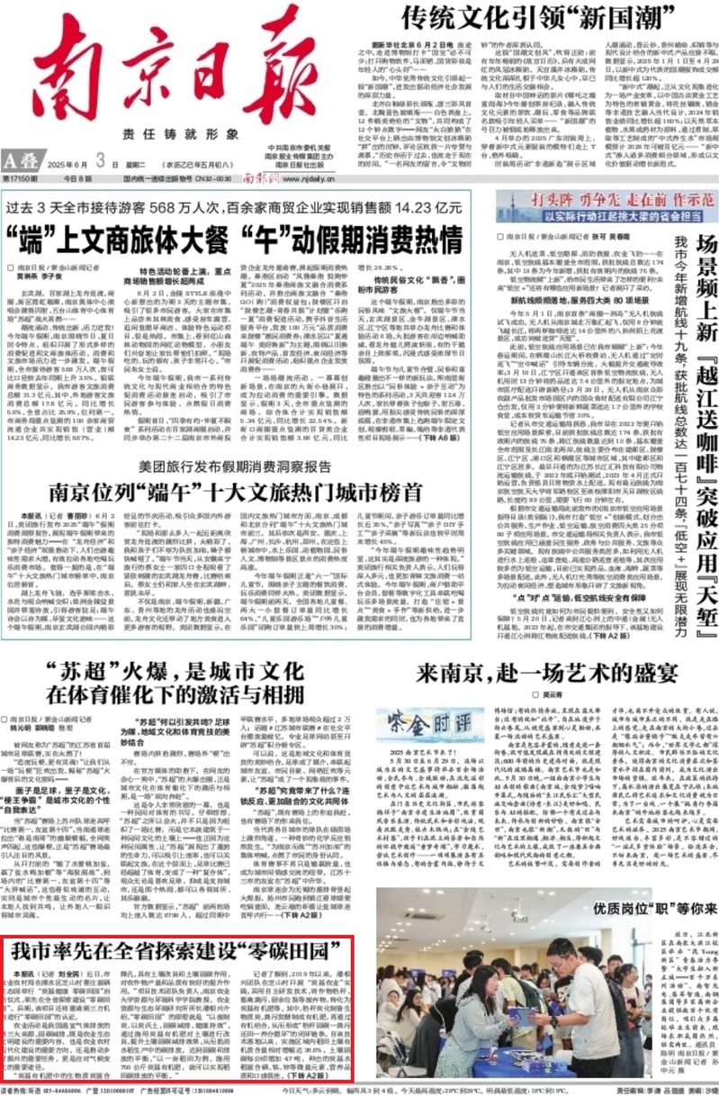 5月30日,南京市農業農村局在溧水區芝山村曹莊富硒生態園舉行“炭基健康 零碳田園”啟動儀式,率先在全省探索建設“零碳田園”,后期該項目還將邀請第三方機構進行“零碳田園”的認證。