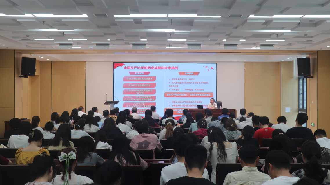 6月5日,校黨委副書記、紀委書記吳榮順在濱江校區食品科技學院B116會議廳為學院學生黨員講授全面從嚴治黨專題形勢與政策課。