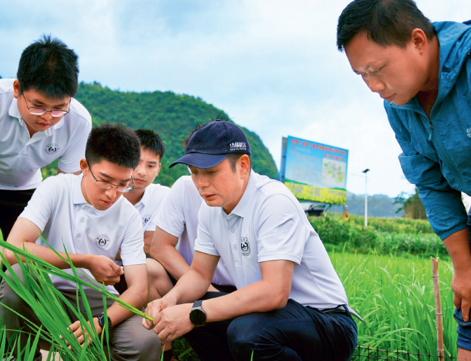 楊弘毅(左一)在老師的指導下了解麻江水稻種植問題