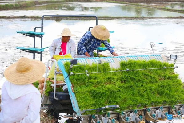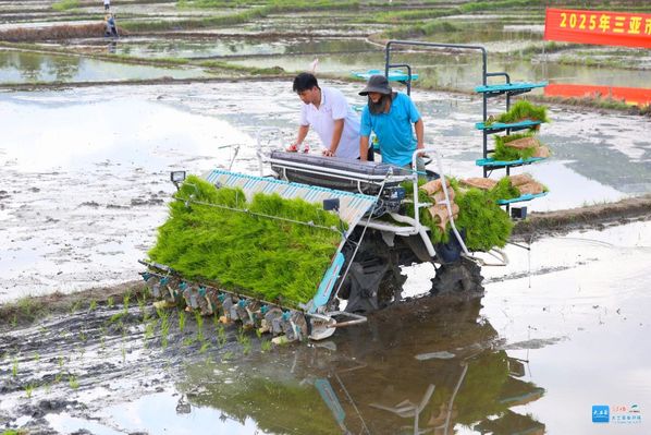 6月6日上午,三亞天涯區過嶺村委會布曲田水稻田洋里熱鬧非凡,一臺插秧機正緩緩駛入田中,一株株嫩綠的秧苗在機器的“擺弄”下,穩穩地扎根于泥土。機器所過之處,一行行整齊的秧苗在水田之上鋪展開來,煥發出勃勃生機。這是2025年三亞市水稻全程機械化輕簡高效栽培技術示范現場觀摩會現場的一幕。